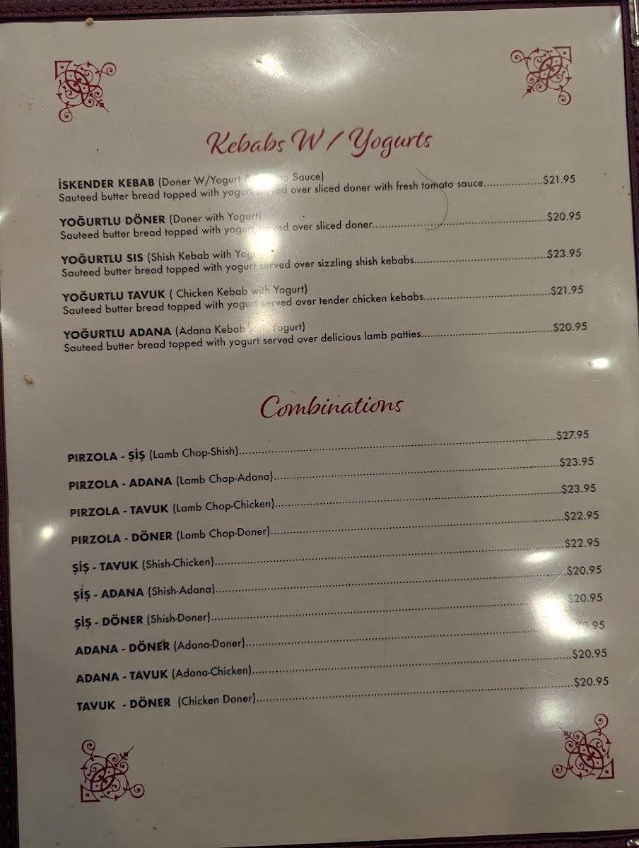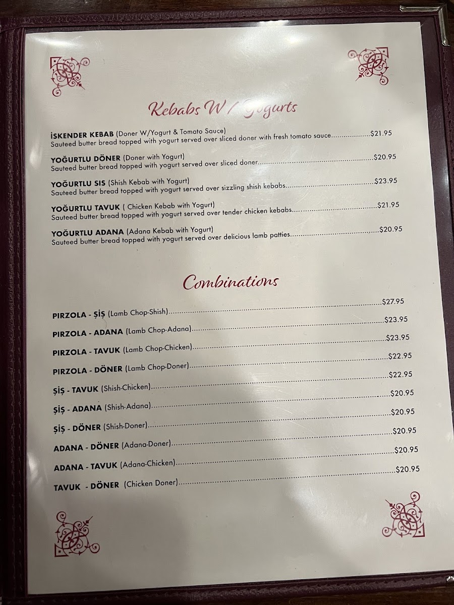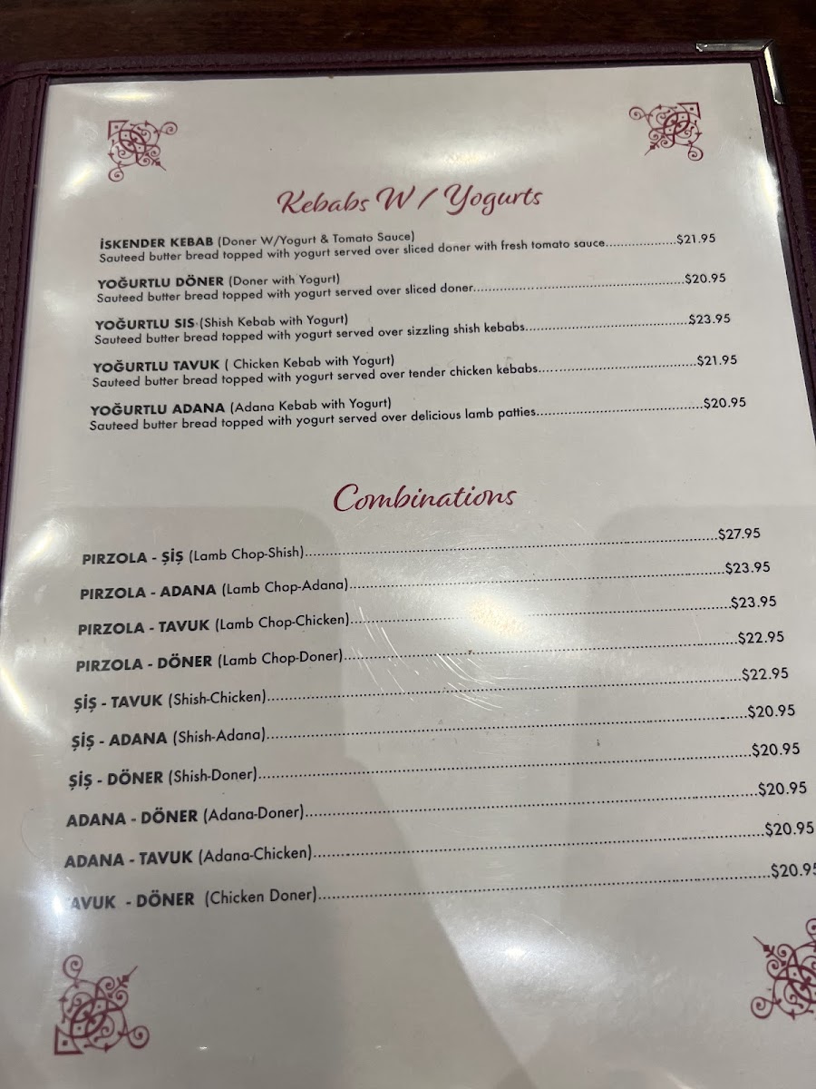 One izgara kofte served with a half portion of adana, chicken & shish kebab